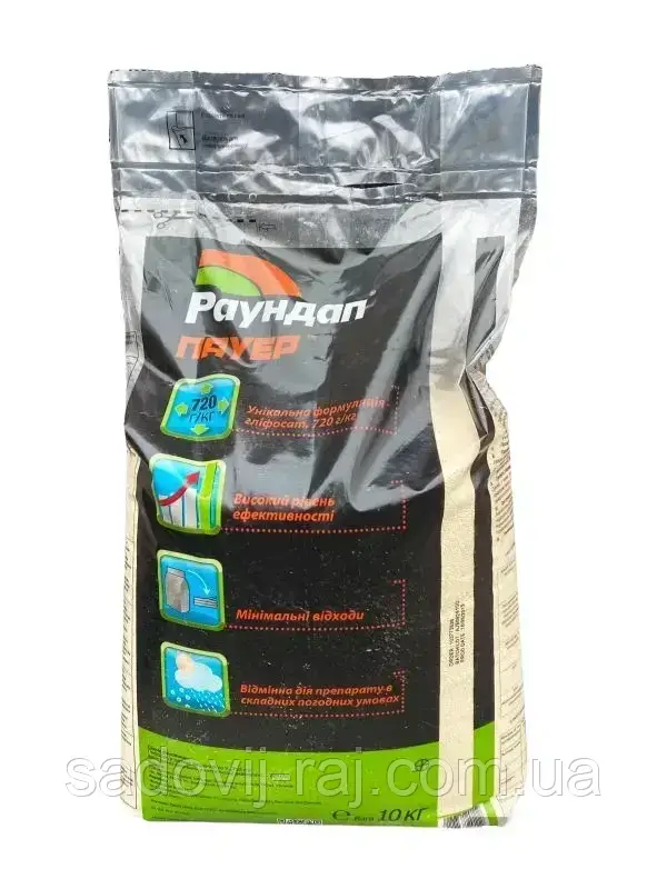 - Раундап Пауер – висококонцентрований системний гербіцид суцільної дії, призначений проти однодольних та дводольних бур'янів, що вегетують на етапі до посіву культури;